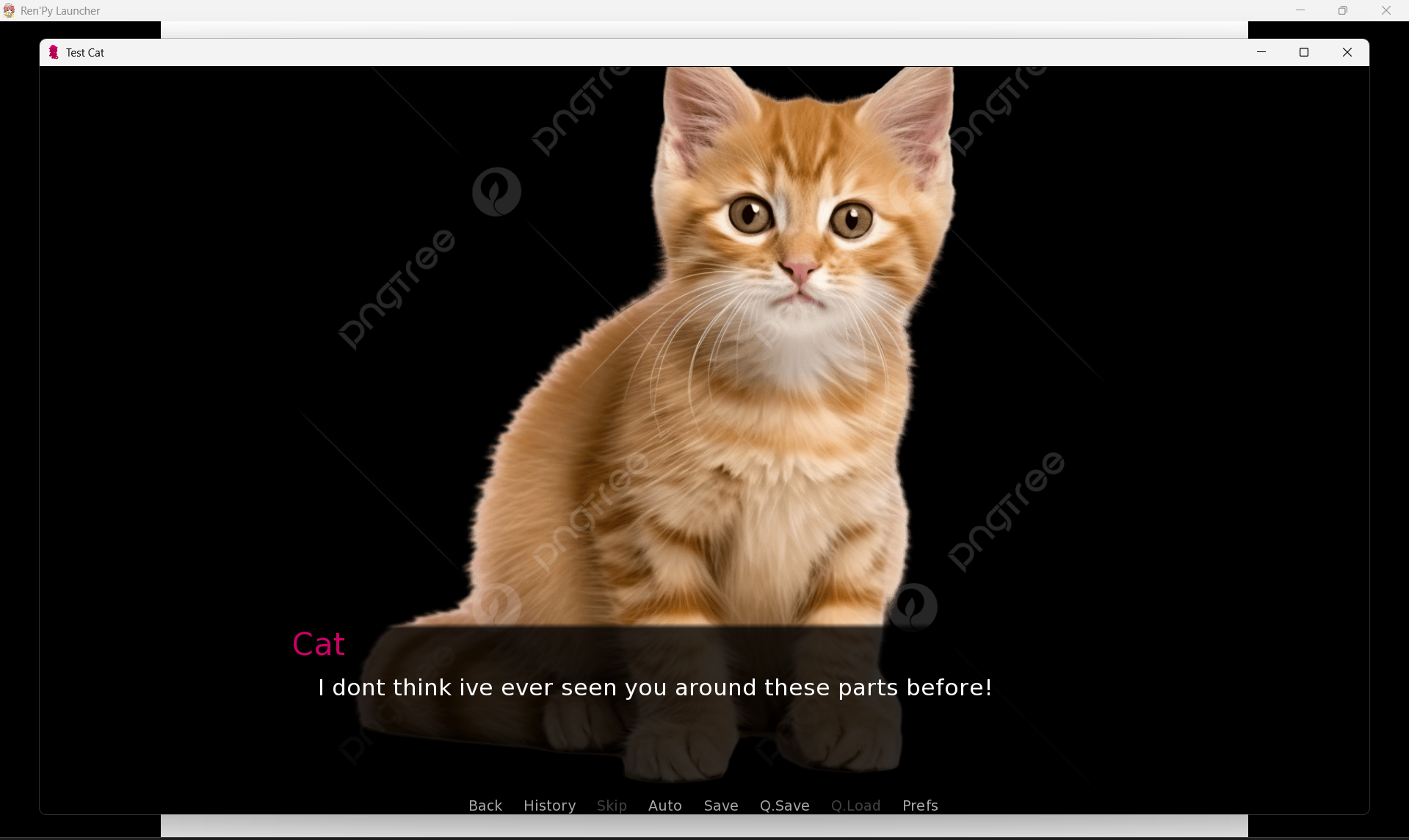 Renpy has been not so bad as I thought it would be! I've struggled a tad with the coding but I'm understanding it a bit as I go! I mean look I got this silly kitty to show up (Attachments)! I'm pretty proud and need to recommend Zeil Tutorials for the great youtube video! Zeils Video Here , which helped me greatly in understanding the basics! And the road ahead looks a little brighter knowing Renpy isn't as intimidating as I thought it would be (THANK GOD) !!!